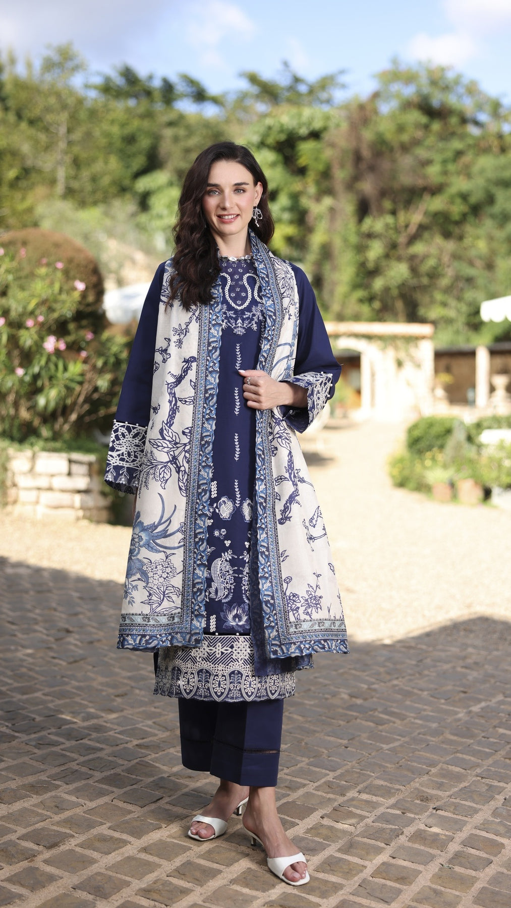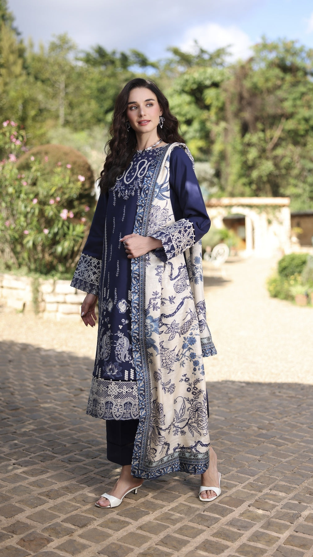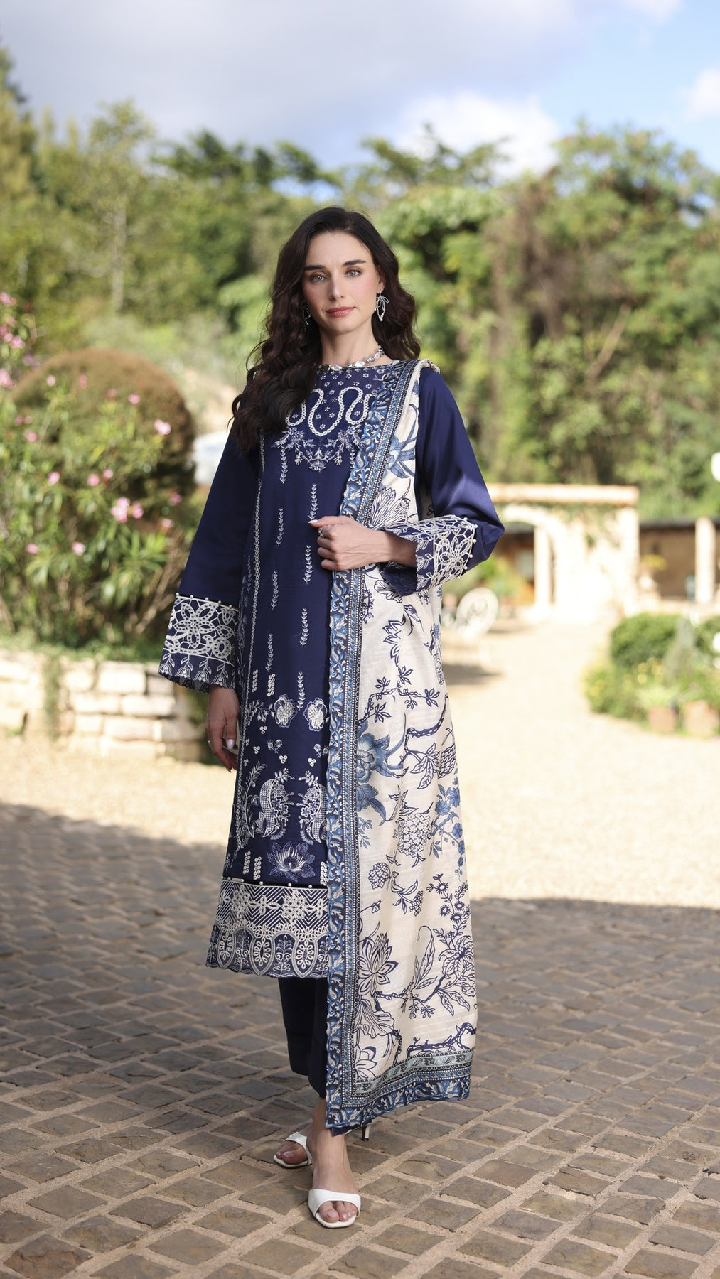 1. Dyed Lawn Front full Embroidered 1.30 yards2. Neck Embroidered Patch 3. Front Border Embroidered Patch 30 inchs 4. Sleeve Border Embroidered Patch 40 inchs 5. Dyed Cotton Trouser 2.75 yards6. Tasar Silk Printed Duppata 2.75 yards