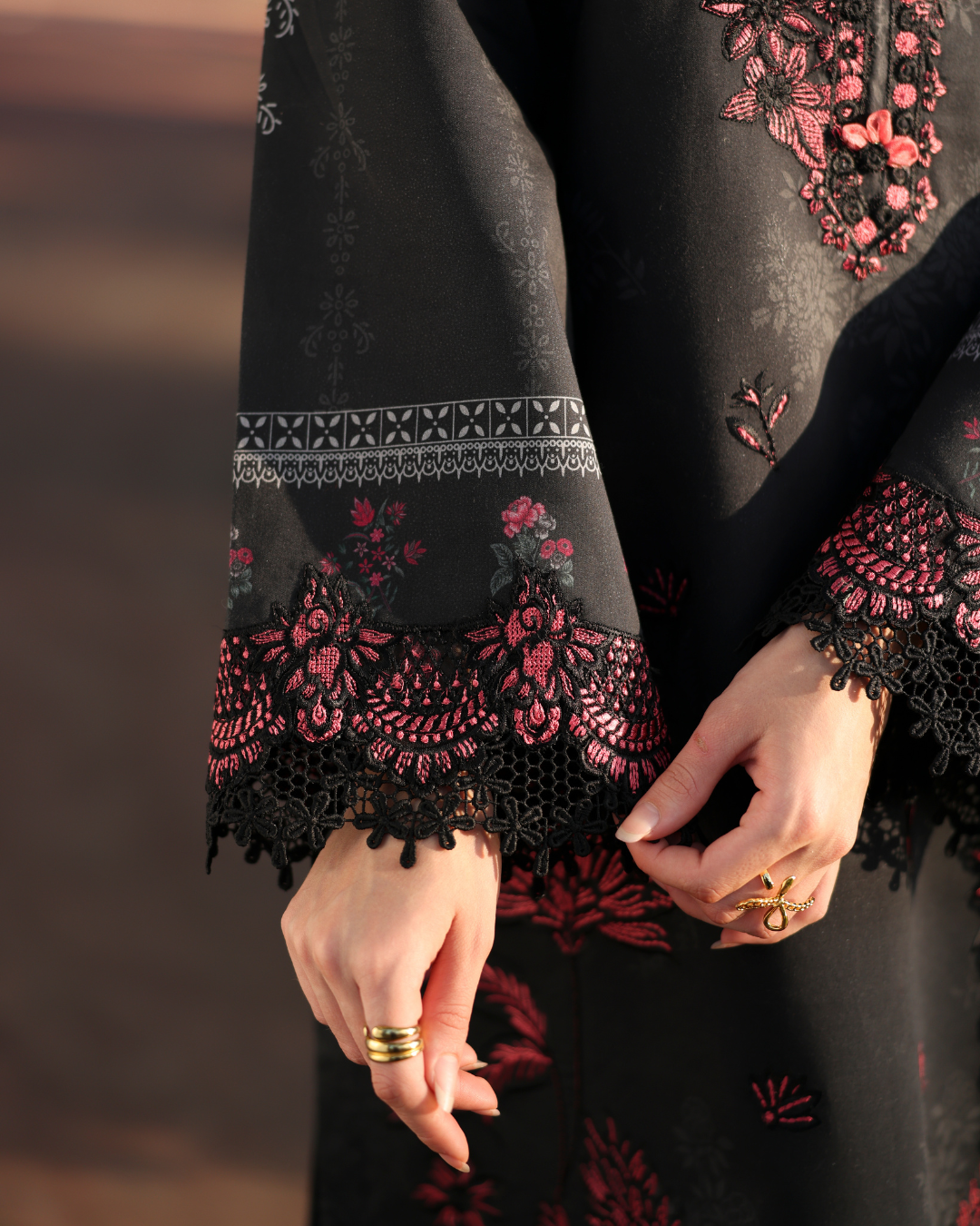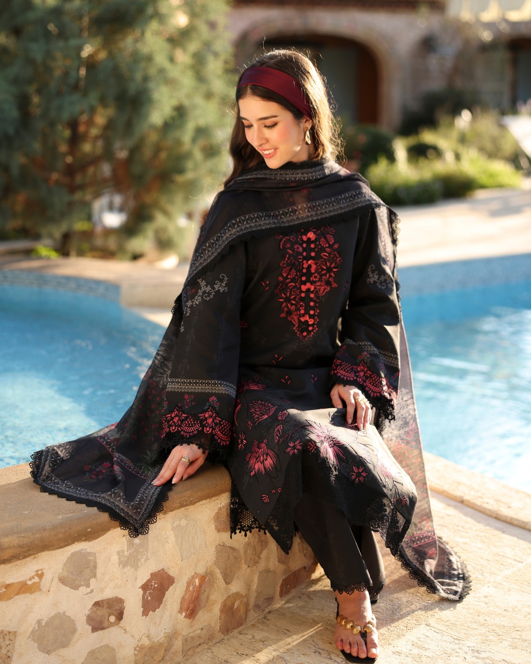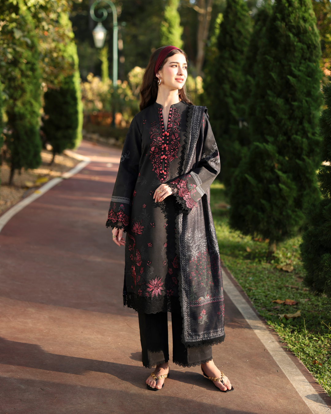 This elegant three-piece black lawn ensemble is accented with rich maroon embroidery, creating a striking contrast. The shirt features intricately embroidered motifs along the neckline, sleeves, and hem, finished with delicate lace detailing for a refined touch. Paired with a matching black trouser, the outfit is completed with a printed dupatta showcasing grey and maroon floral motifs. Crafted from premium breathable lawn fabric, this ensemble offers both style and comfort.