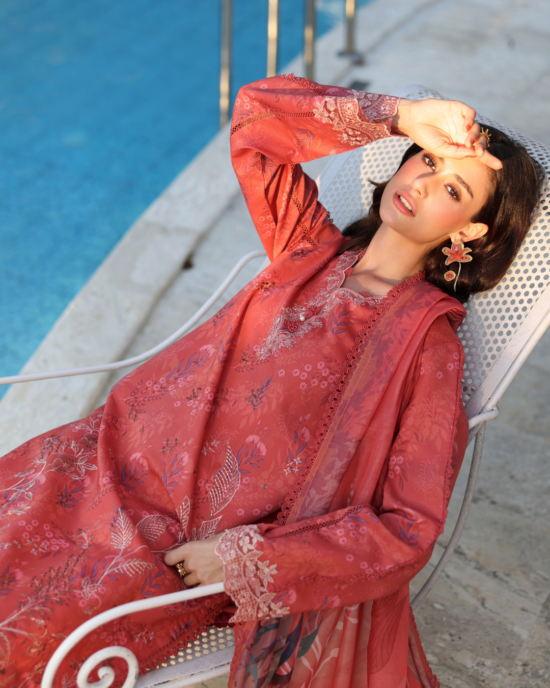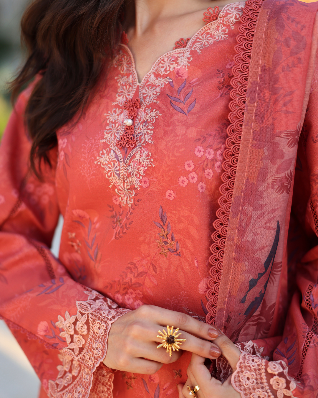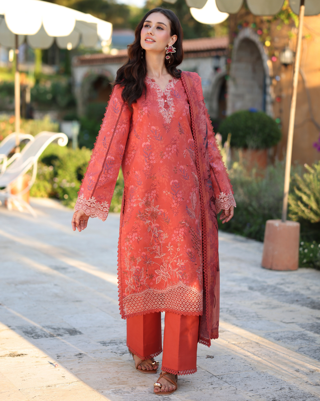 This three-piece lawn suit is designed in a warm terracotta colour palette, enhanced with floral patterns across the shirt. Embroidery is thoughtfully placed along the neckline, sleeves, and hem, adding depth to the design. The matching dupatta features complementary floral detailing, bringing together a harmonious and stylish summer look.