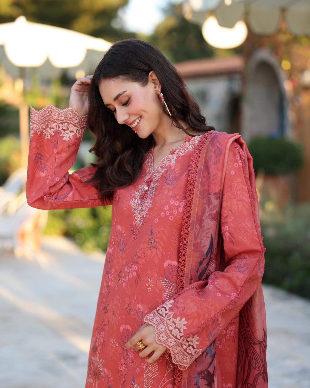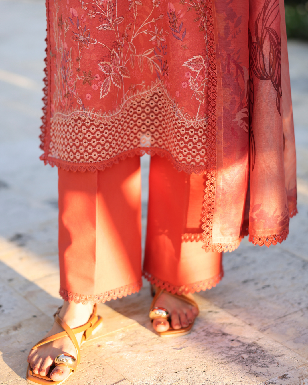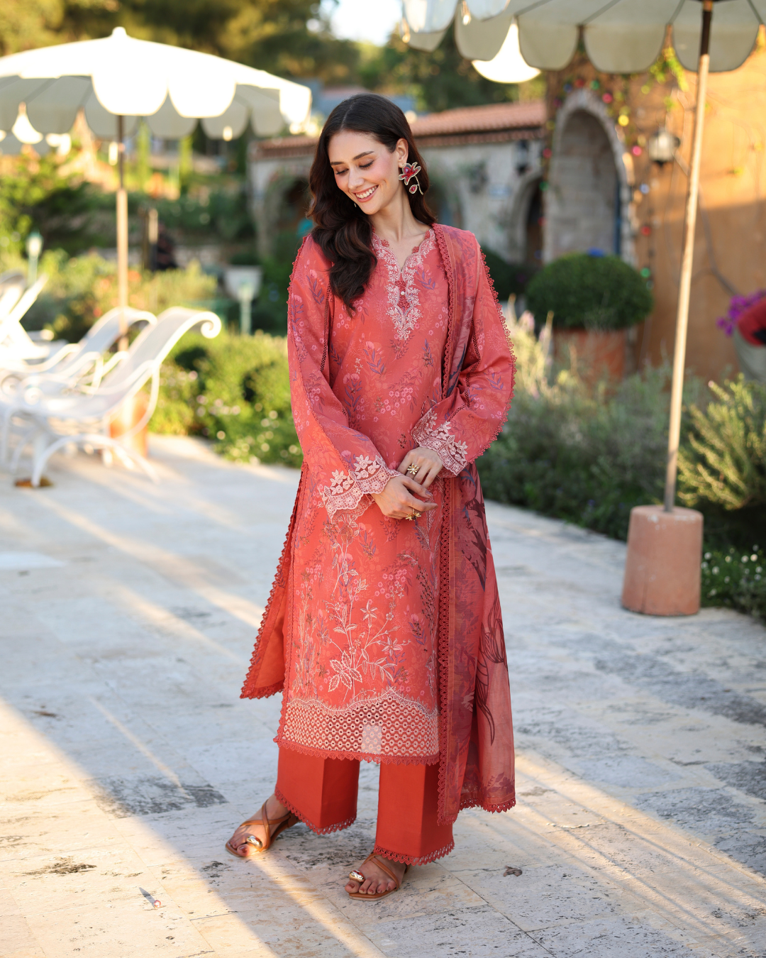 This three-piece lawn suit is designed in a warm terracotta colour palette, enhanced with floral patterns across the shirt. Embroidery is thoughtfully placed along the neckline, sleeves, and hem, adding depth to the design. The matching dupatta features complementary floral detailing, bringing together a harmonious and stylish summer look.