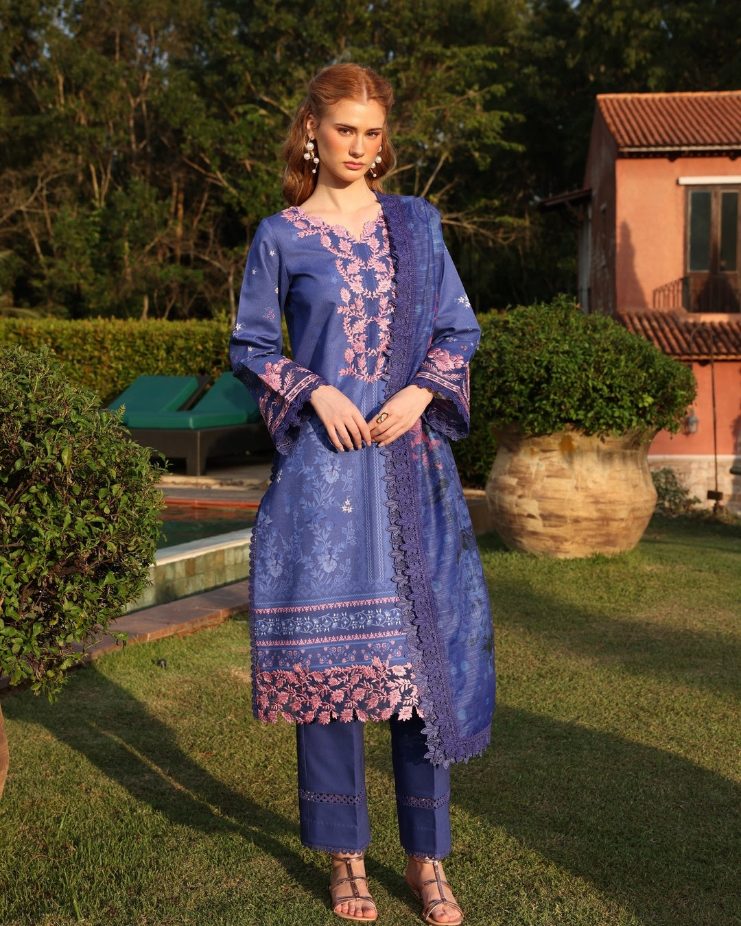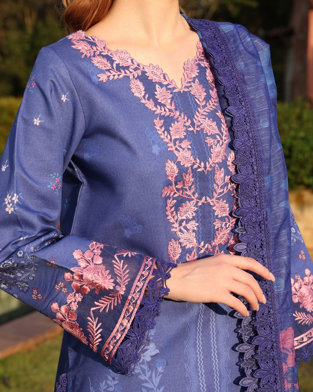 This 3-piece outfit features a striking blue color as its base, complemented by delicate pink embroidery. The ensemble is adorned with floral patterns, while the embroidery is concentrated on the neckline, sleeves, and borders.