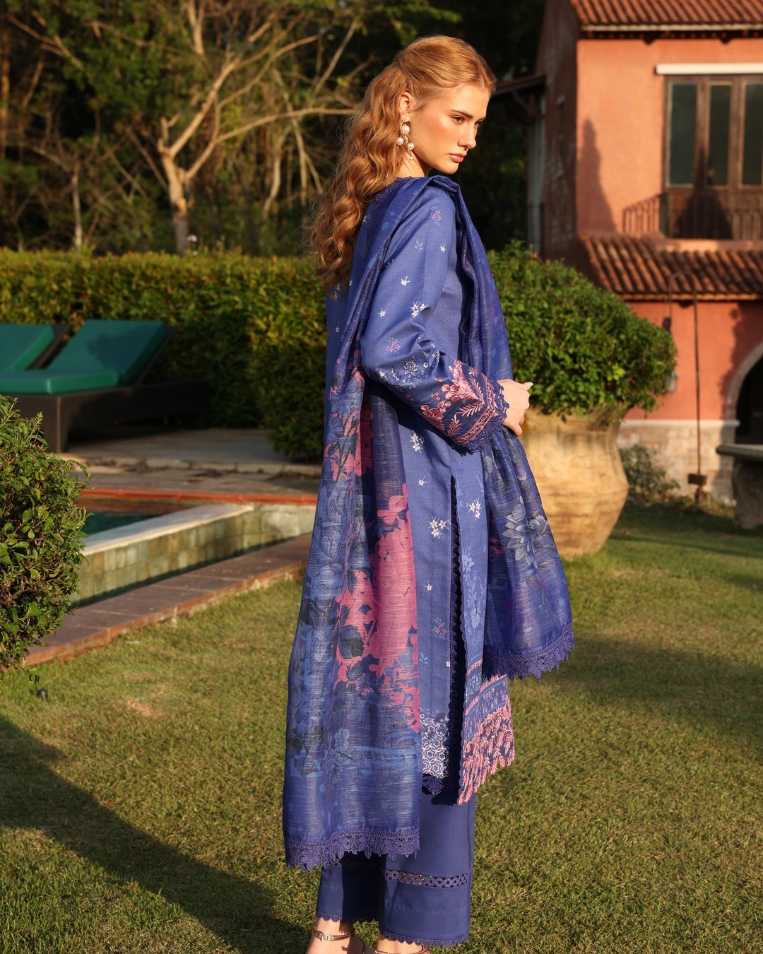 This three-piece lawn suit radiates understated elegance with a luminous digital print on fine lawn fabric. The neckline is highlighted with an intricately embroidered patch, complemented by a delicately embroidered front border and refined sleeve detailing. Paired with a dyed cotton trouser and a printed poly raw net dupatta, this ensemble embodies effortless summer sophistication.
