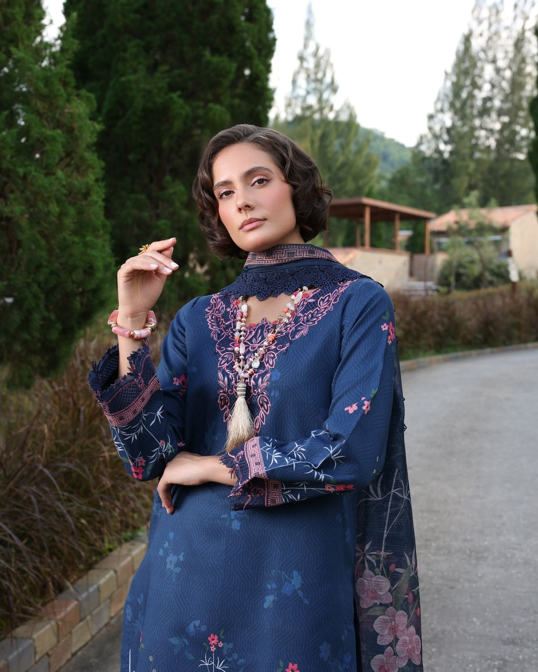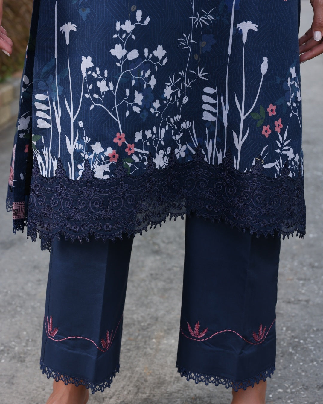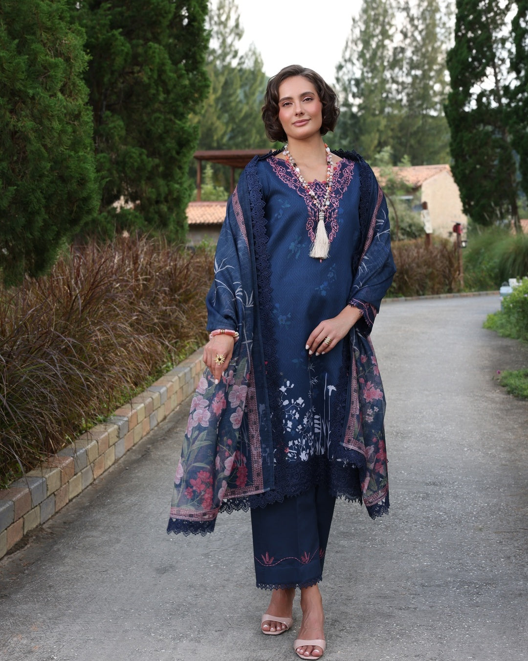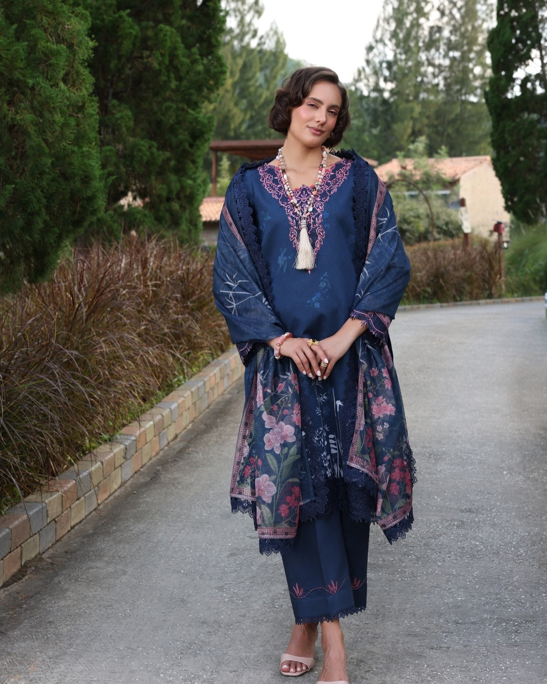 The 3-piece ensemble showcases a deep navy hue as its foundation, beautifully accented with floral patterns and embroidery in shades of pink. The embroidery is concentrated on the neckline, sleeves, and borders, enhancing the design. The dupatta features delicacy, and the overall aesthetic is elegant and sophistication .