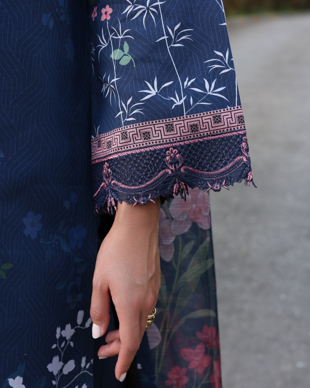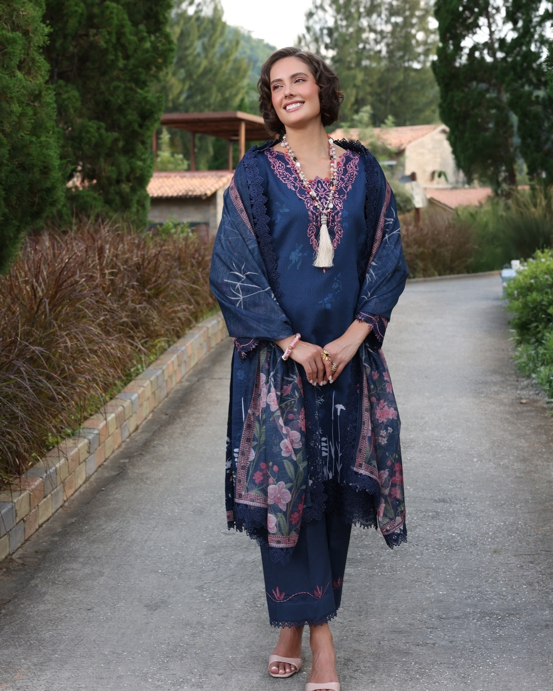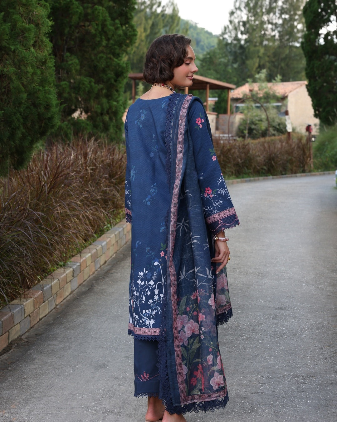 The 3-piece ensemble showcases a deep navy hue as its foundation, beautifully accented with floral patterns and embroidery in shades of pink. The embroidery is concentrated on the neckline, sleeves, and borders, enhancing the design. The dupatta features delicacy, and the overall aesthetic is elegant and sophistication .