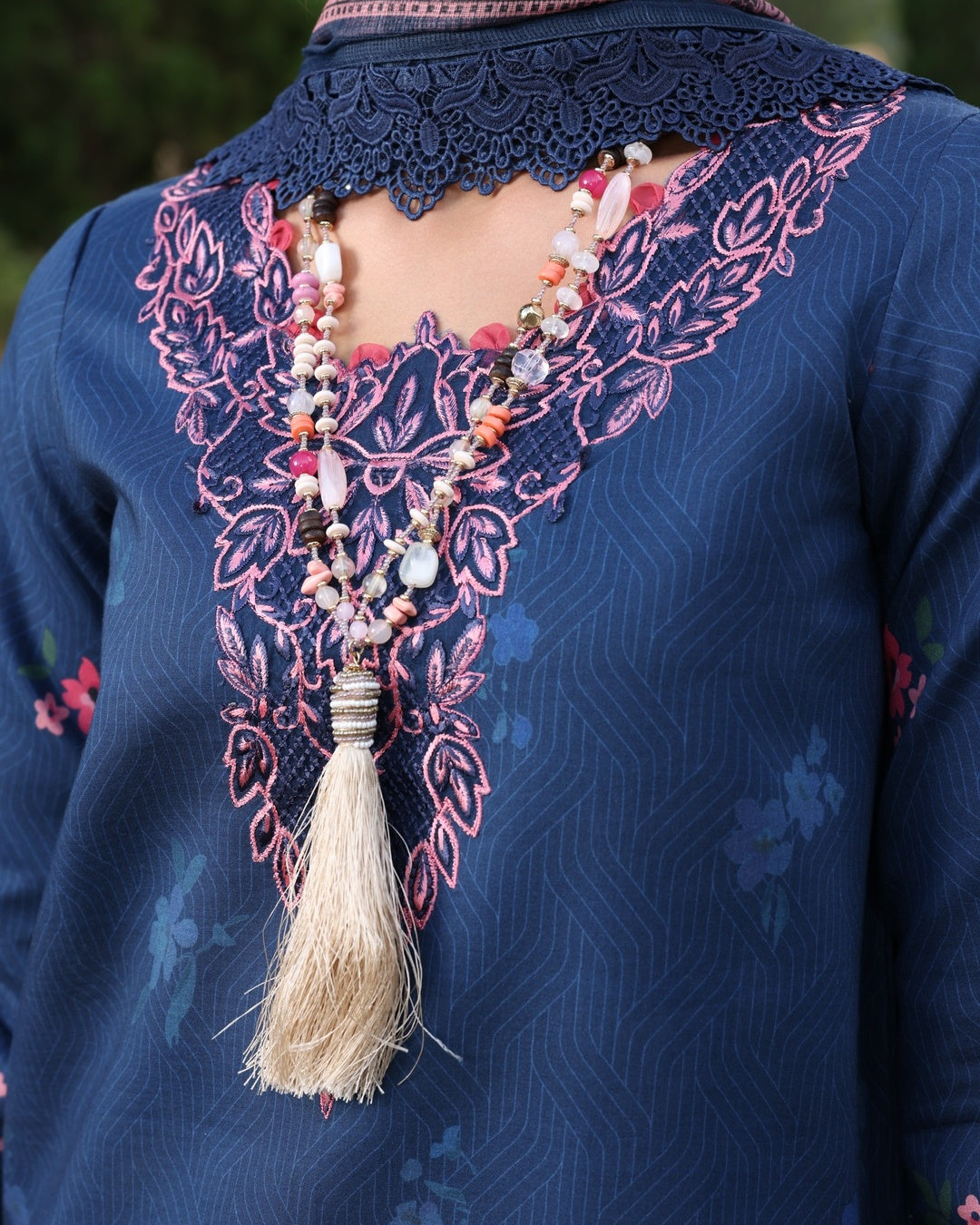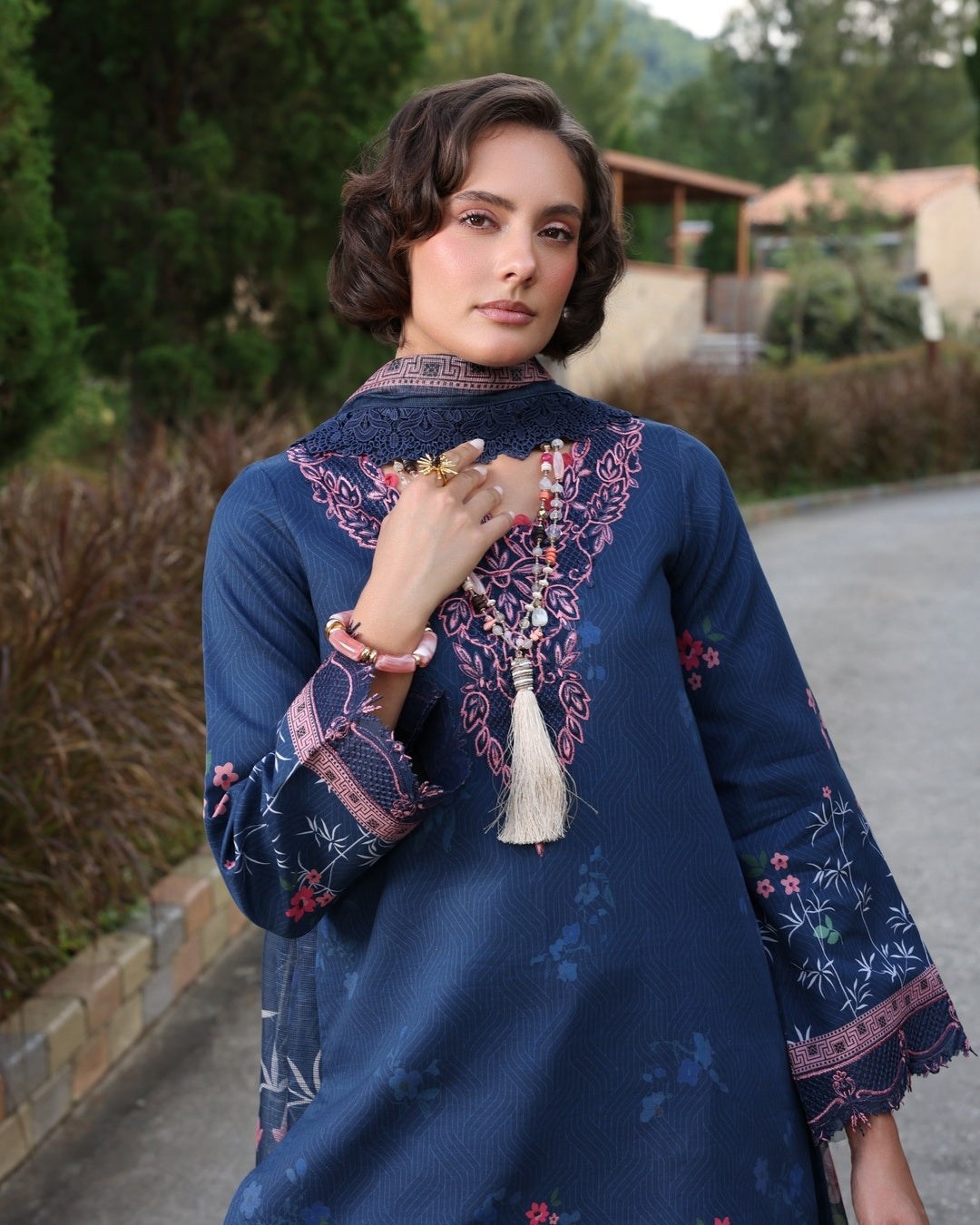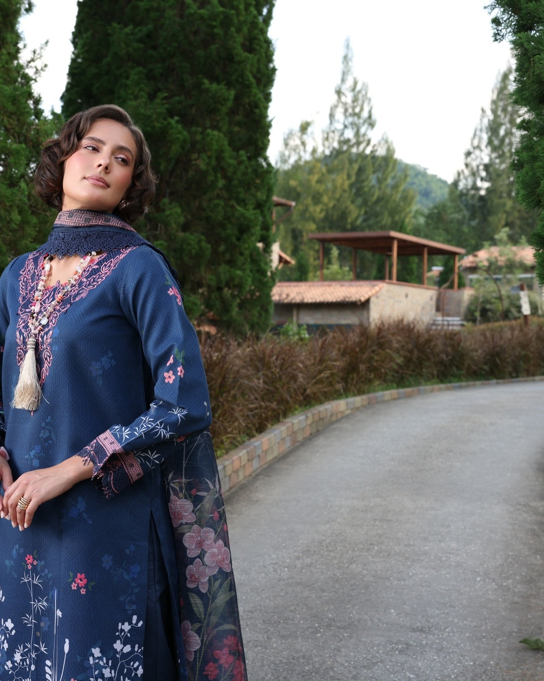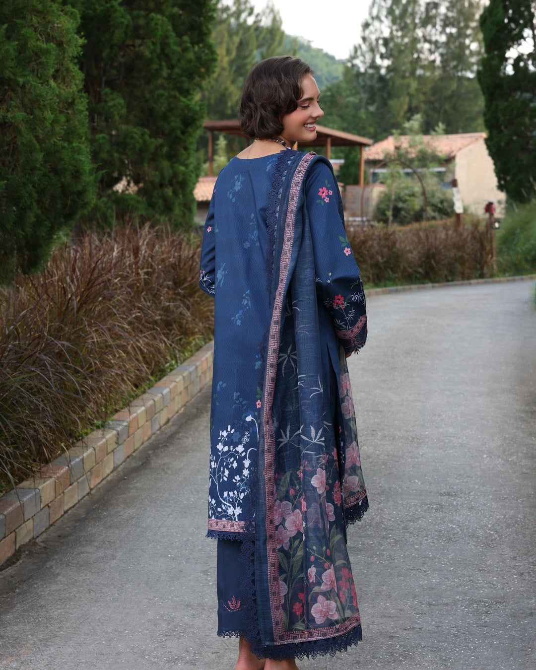 The 3-piece ensemble showcases a deep navy hue as its foundation, beautifully accented with floral patterns and embroidery in shades of pink. The embroidery is concentrated on the neckline, sleeves, and borders, enhancing the design. The dupatta features delicacy, and the overall aesthetic is elegant and sophistication .
